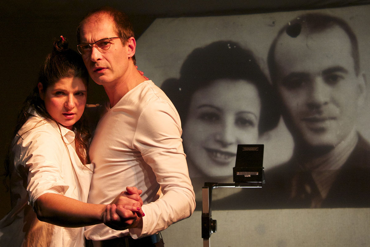 C’est en larmes qu’Alain Berenboom est venu saluer le public, aux côtés de l’équipe artistique, à la fin de Monsieur Optimiste, adapté de son roman (Prix Rossel en 2013). Une émotion qui révèle, plus que tout, la fidélité avec laquelle Christine Delmotte restitue son histoire sur scène. Ou plutôt l’histoire de ses parents, Juifs polonais installés en Belgique où ils se sont mariés en même temps qu’éclatait la guerre.