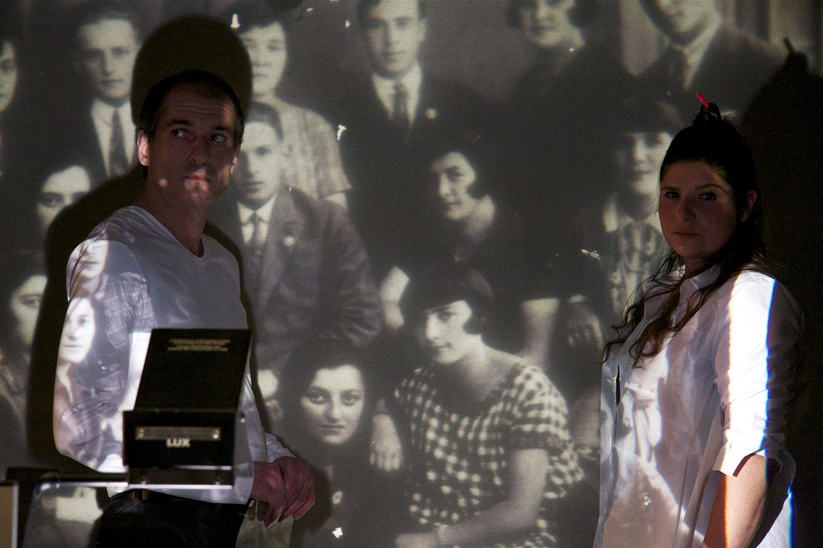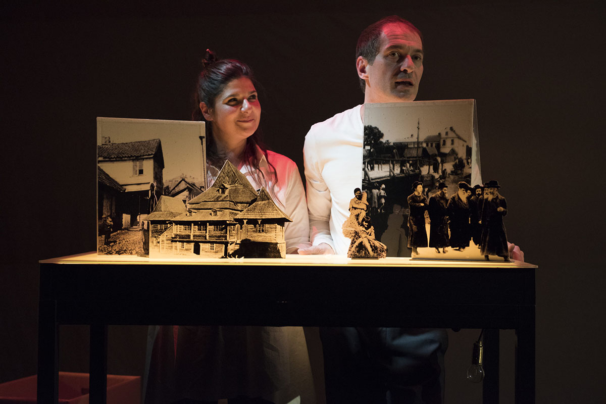 La mise en scène lui permet de mettre en images des documents auxquels le livre fait référence, elle joue avec les sons, mêle ombres chinoises, théâtres d’objets et chants yiddish. Elle mise résolument sur l’interaction avec le public, régulièrement interpellé durant la pièce, à l’image d’une stand-up comedy.
