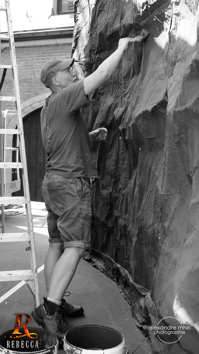 Dans un atelier, des mains expertes entrent en scène. On trace, on découpe, on soude, on assemble. On crée des structures solides pour soutenir l’illusion. Et puis on transforme le bois brut en pierre ancienne, une planche de contreplaqué en moulure baroque.