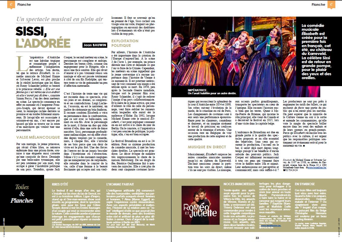 Critique - La preview à laquelle j’ai assisté est une représentation forte, avec des chorégraphies serrées, une mise en scène qui parvient à amadouer toutes les difficultés d’une scène en plein tout en en magnifiant les avantages, un orchestre (dirigé par Laure Campion) qui approche de la perfection et une distribution en or. Et à la fin de cette avant-première, nous ressentons qu’il y a encore quelques opportunités de croissance qui suggèrent que c’est un des incontournables joyaux de cet été. (…) Marie-Pierre de Brienne (Sissi) vient du Québec pour jouer ici à Bruxelles. Elle incarne Elisabeth d’une manière convaincante; jeune poulain au début, femme mûre et amère à la fin. (…) Anne Mie Gils a trouvé le parfait mélange d’arrogance impériale et de rigueur pour sa Sophie. La Mort est magistralement interprétée par Nicolas Kaplyn. Séduisant, charmeur, il peut faire succomber quiconque. Seule sa relation avec Sissi est compliquée, et cela est très bien rendu. L’assassin Luigi Lucheni est joué par l’extravagant par Antonio Macipe. En tant que conteur de l’histoire, il apporte avec lui une dimension supplémentaire au musical. Arnaud Masclet pose un Français-Joseph digne, vieillissant scène après scène, tout en restant totalement juste. (…) La plus grande surprise est Lander van Nuffelen. Il incarne un incroyable prince Rodolphe à la fois en termes de jeu, de présence et de voix. Nous pouvons être brefs sur cette performance vocale: Waow. Cela s’applique à toute la distribution et à l’ensemble. (…) Encore un remerciement aux Anges de la Mort. Les metteurs en scène les ont rendus très présents et cela fonctionne très bien. Ils renforcent la présence de la Mort à maintes reprises, grâce aux mouvements serrés et aux habiles chorégraphies de Kylian Campbell.