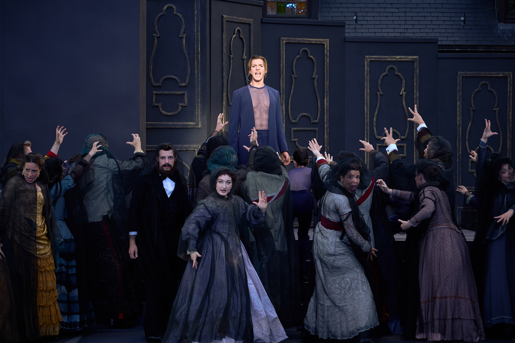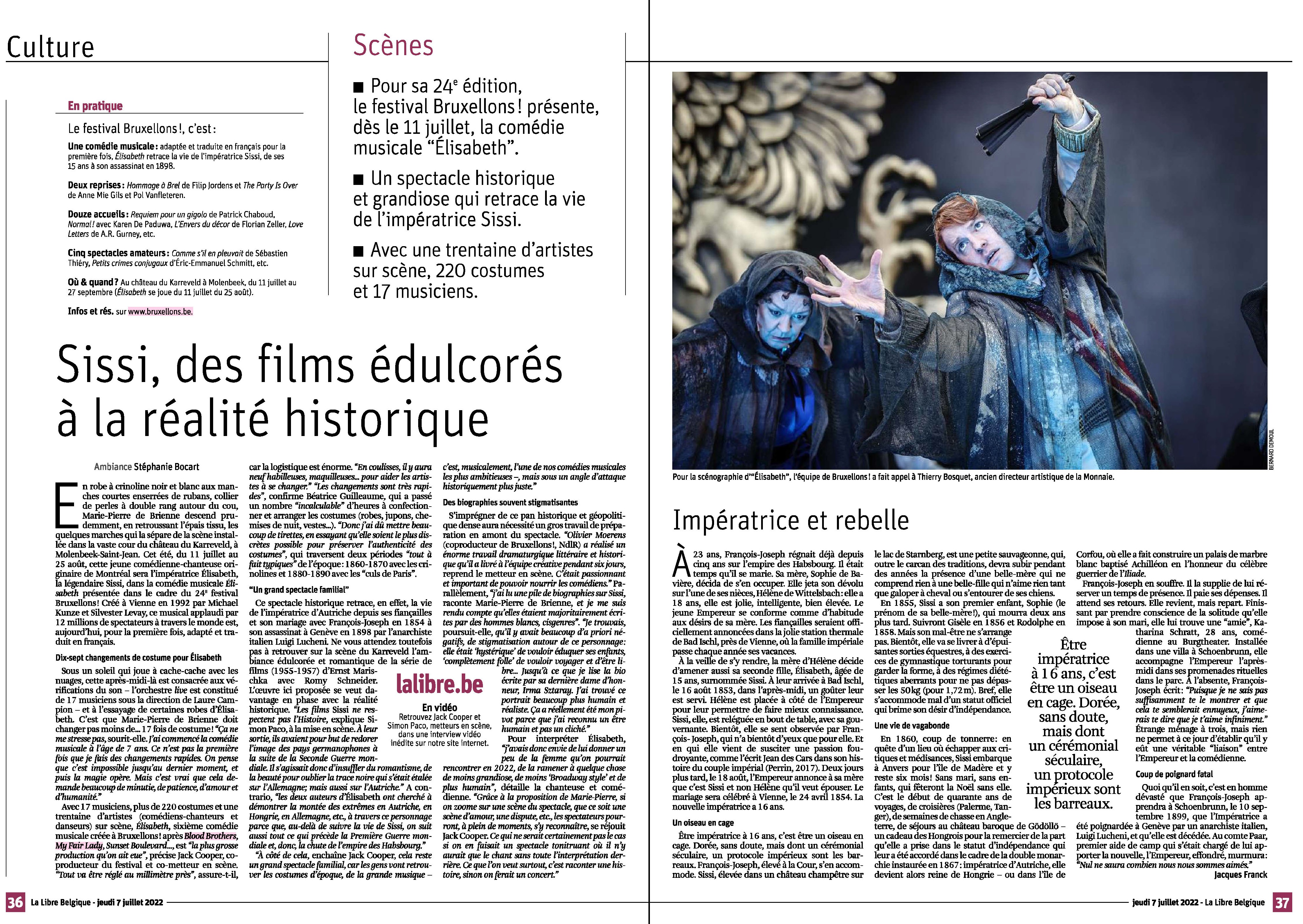 Analyse - « On conserve une liberté artistique mais on doit respecter l’œuvre », analyse Oliver Moerens. « ll n’est pas question qu’Elisabeth soit seins nus et se mette à faire des claquettes mais on peut discuter de beaucoup de choses. Là où le personnage de la Mort, par exemple, est normalement en costume d’époque, nous voulions quelque chose de plus contemporain. » Ce qui donne, à Bruxellons, une sorte de rockeur intemporel grâce à l’électrique Kaplyn. Même chose avec le personnage du narrateur (qui joue aussi l’anarchiste assassin de Sissi) qui trouve en la personne d’Antonio Macipe une présence savoureusement indisciplinée. Alors que l’équipe de Bruxellons se penche déjà sur le « musical » de l’été prochain – un West Side Story qu’ils souhaitent plus moderne que les versions archi connues – une incertitude plane toujours sur le futur : « Si nous n’obtenons pas de contrat-programme en 2023, ce n’est pas sûr qu’on continuera », soupire Oliver Moerens, fatigué du manque de reconnaissance local, tandis que leur renommée a dépassé les frontières : ils ont reçu cette année un Trophée d’honneur aux Prix de la Comédie musicale à Paris.